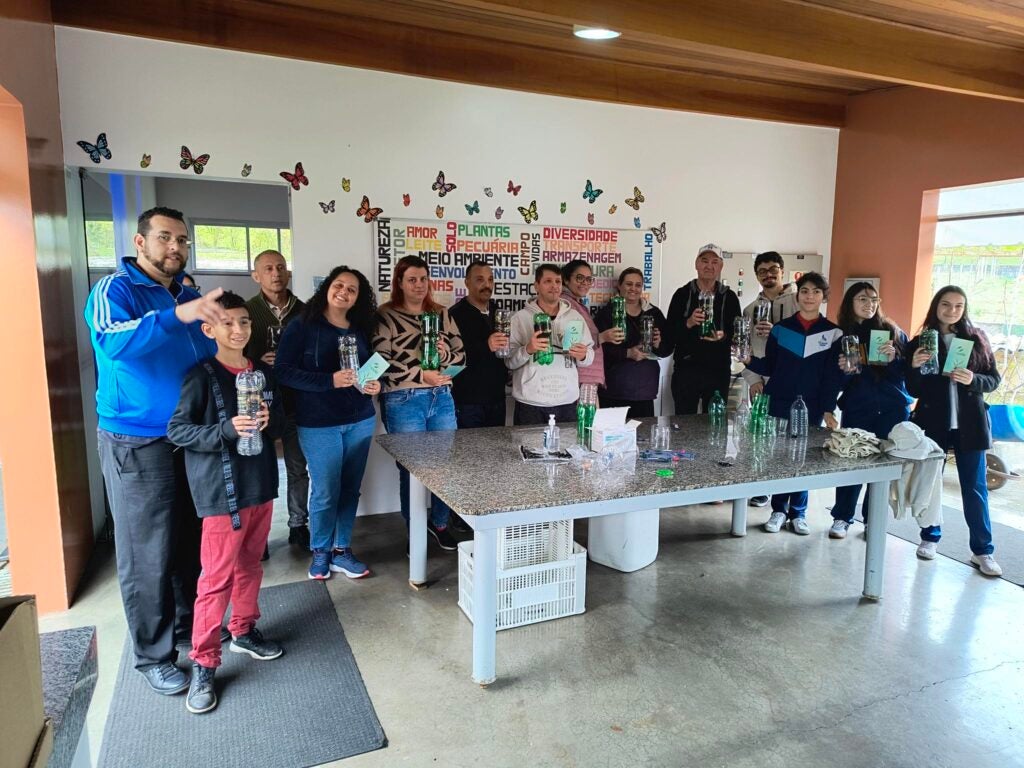 Na etapa prática da oficina, os convidados montaram, de forma artesanal, suas próprias composteiras residenciais utilizando materiais recicláveis como garrafas PET, terra, areia e resíduos orgânicos. Essa experiência possibilitou não apenas o aprendizado sobre o funcionamento da compostagem, mas também a valorização de recursos simples que podem gerar grande impacto positivo.